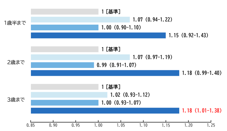 ()内の数値:95%信頼区間 「本当の値が入っていそうな範囲」を示します。この範囲が1をまたがない時、その結果は「はっきり差がある」と言えます。(3歳までのグラフの、赤色の数値。)